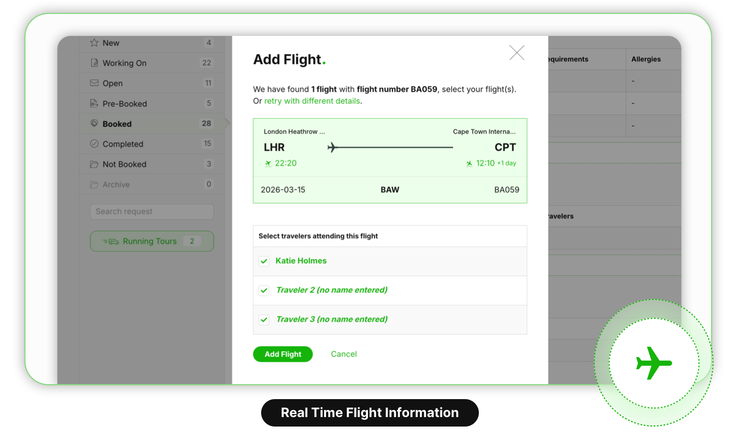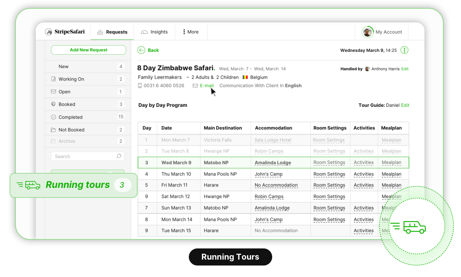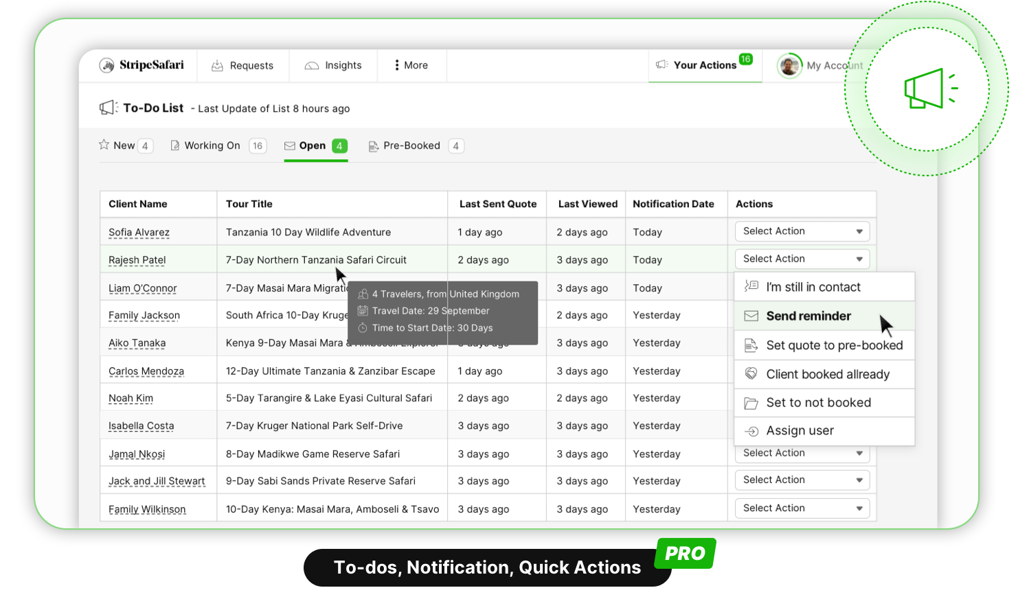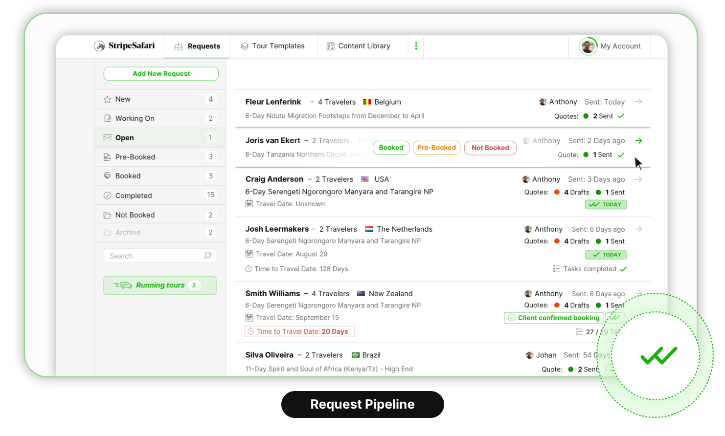From the initial received request to the actual booking, follow the status of a quote request. See who’s been working on it, if and when the client has opened it and also when a travel date is coming up soon.