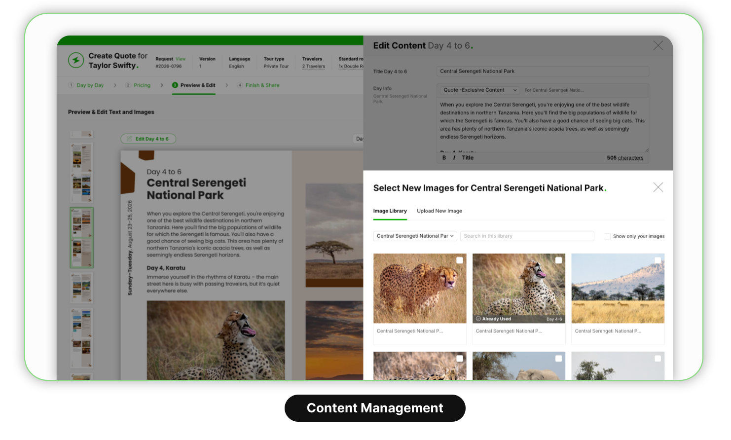 Just click and create an itinerary based on content from our database. The quote builder is easy to use and allows for great flexibility when creating and customizing itineraries on a day-by-day level.